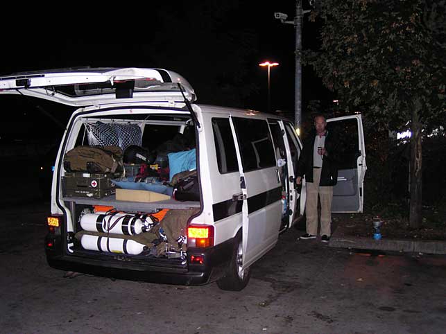 Das anschließende Beladen des Busses dauerte dann leider bis spät in die Nacht, da das Heckklappenschloss des T4 den Geist aufgab. Eine provisorische Zugvorrichtung musste her. |