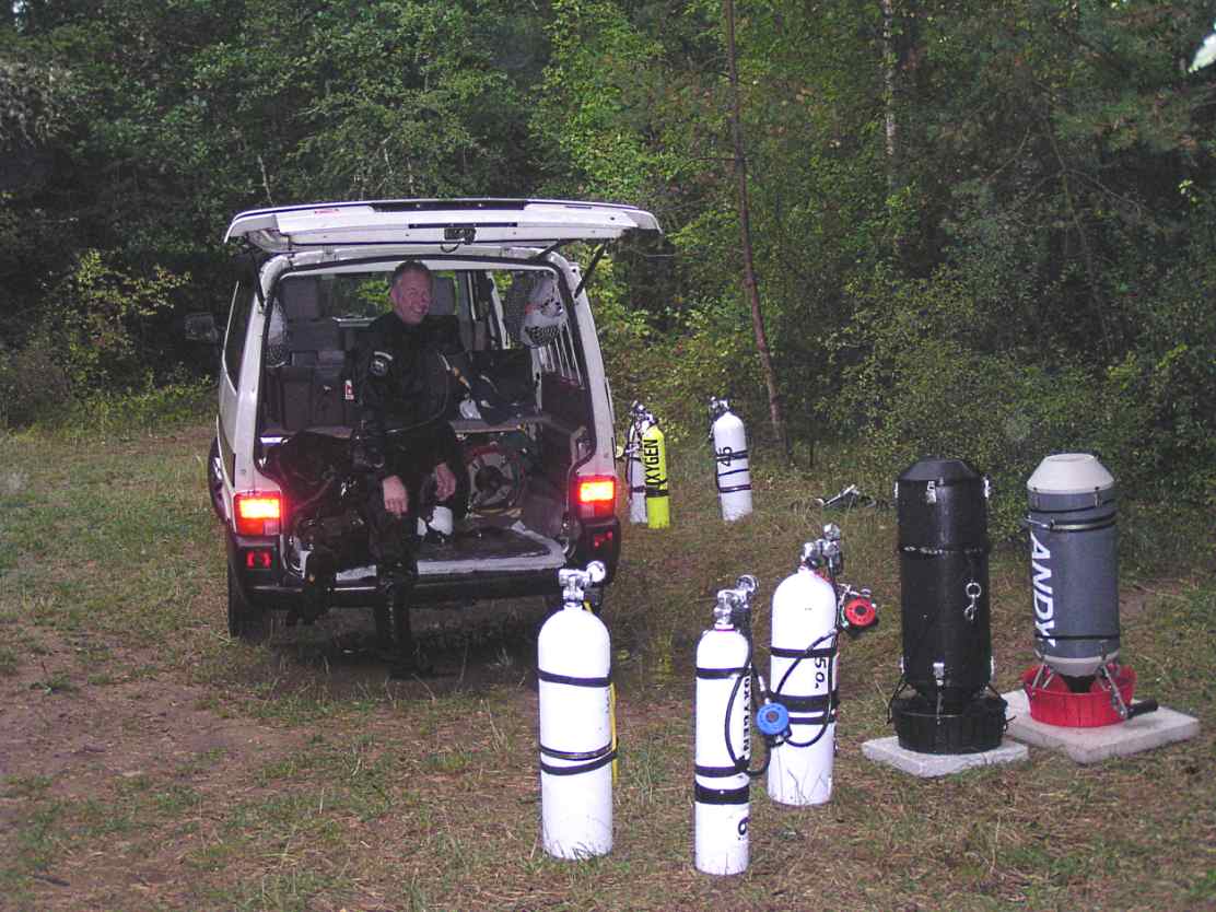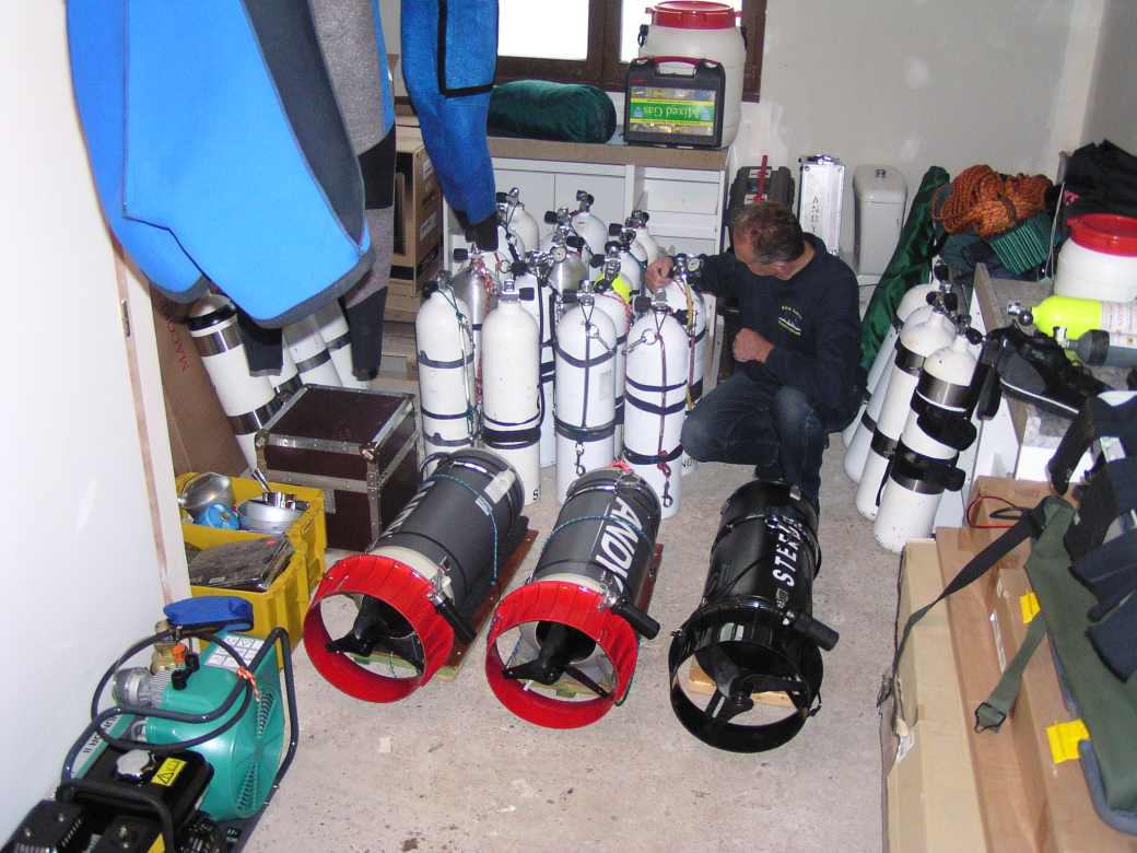Das Doppelgerät mit dem 18/50 war teilweise verbraucht und konnte nur noch zu einem schwachen Trimix aufgetoppt werden, da es uns zu mühselig gewesen war, extra He in einer großen Speicherflasche mitzuschleppen.