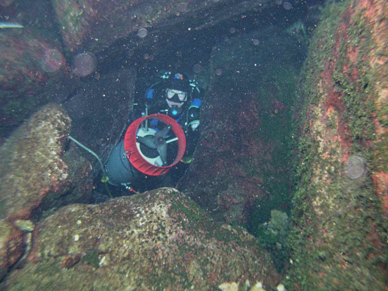 Ich tauchte zunächst voraus nach links in einen mir noch unbekannten Gang, der schnell immer enger wurde. Kurz zurückschauend sah ich meinen Freund fast gänzlich in starken Aufwirbelungen von feinem Sediment verschwinden.