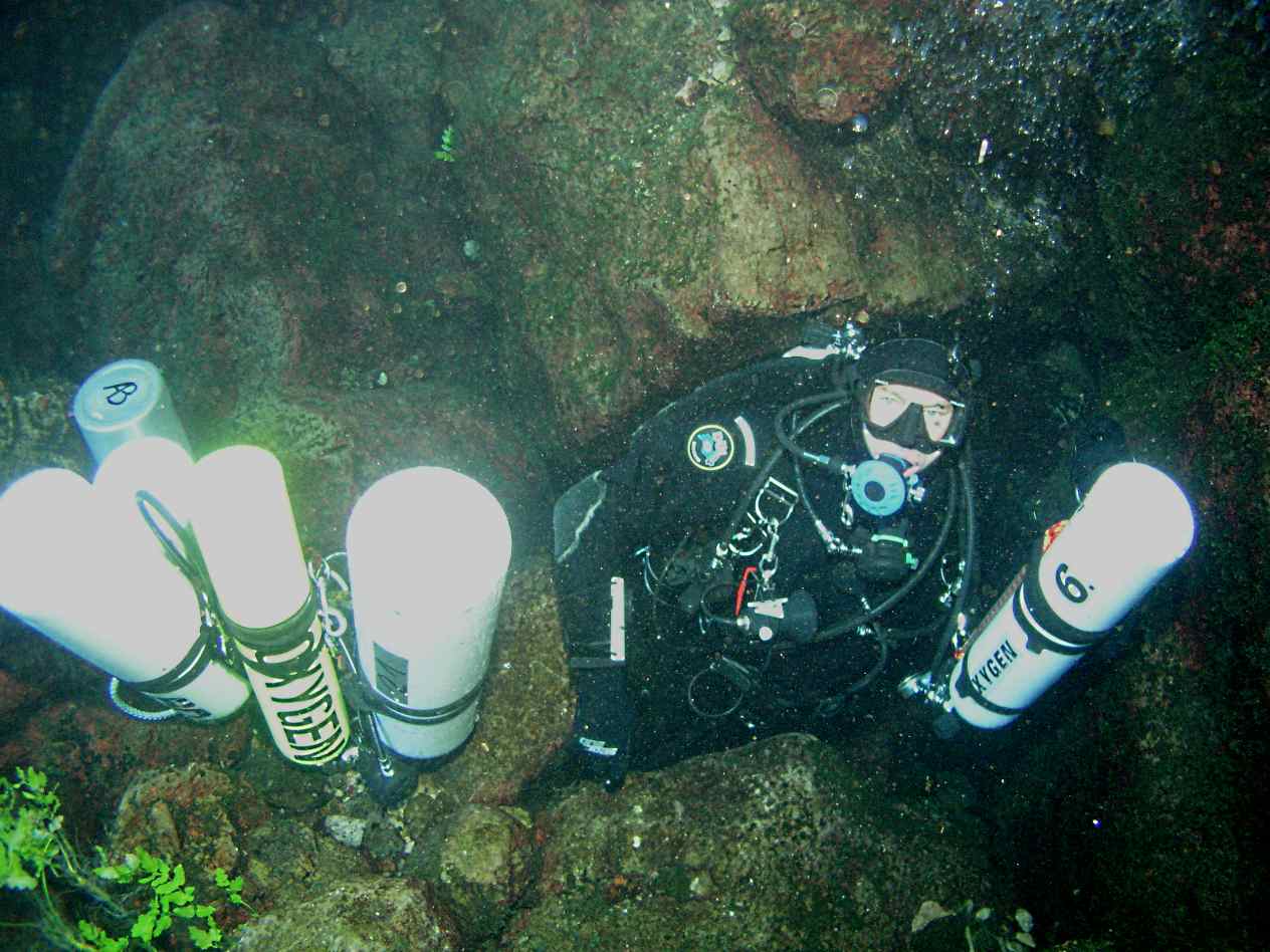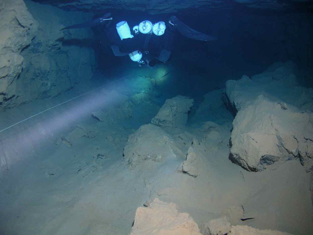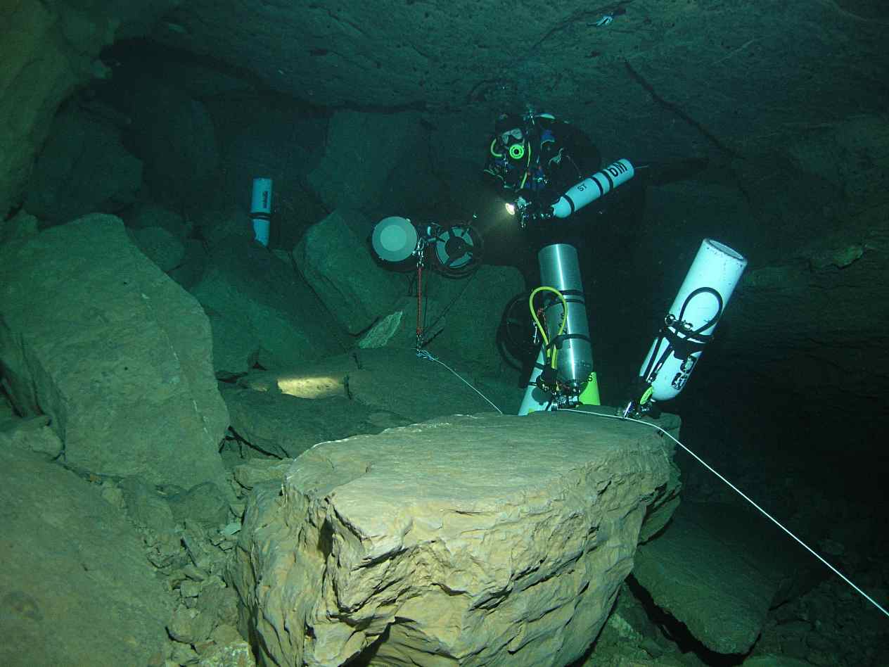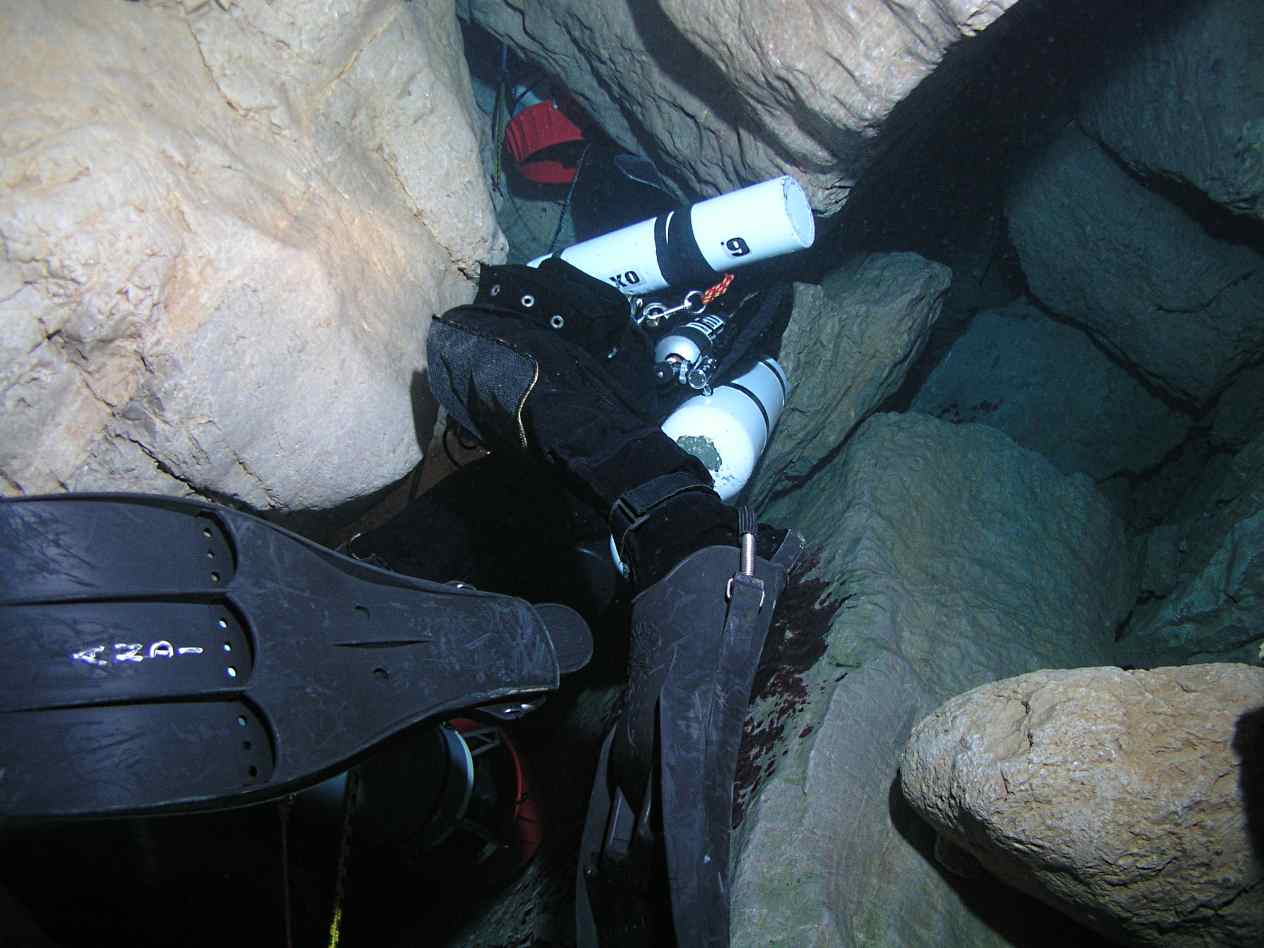 So auch diesmal. Der anfänglich recht enge, an einigen Stellen stark einsiltende Gang geht nach 30m in eine geräumige Passage über, die sich vorbei an zwei Nebengängen in Tiefen von 25 - 30m bequem bis zu ihrem Ende, einem senkrechten Spalt betauchen lässt.