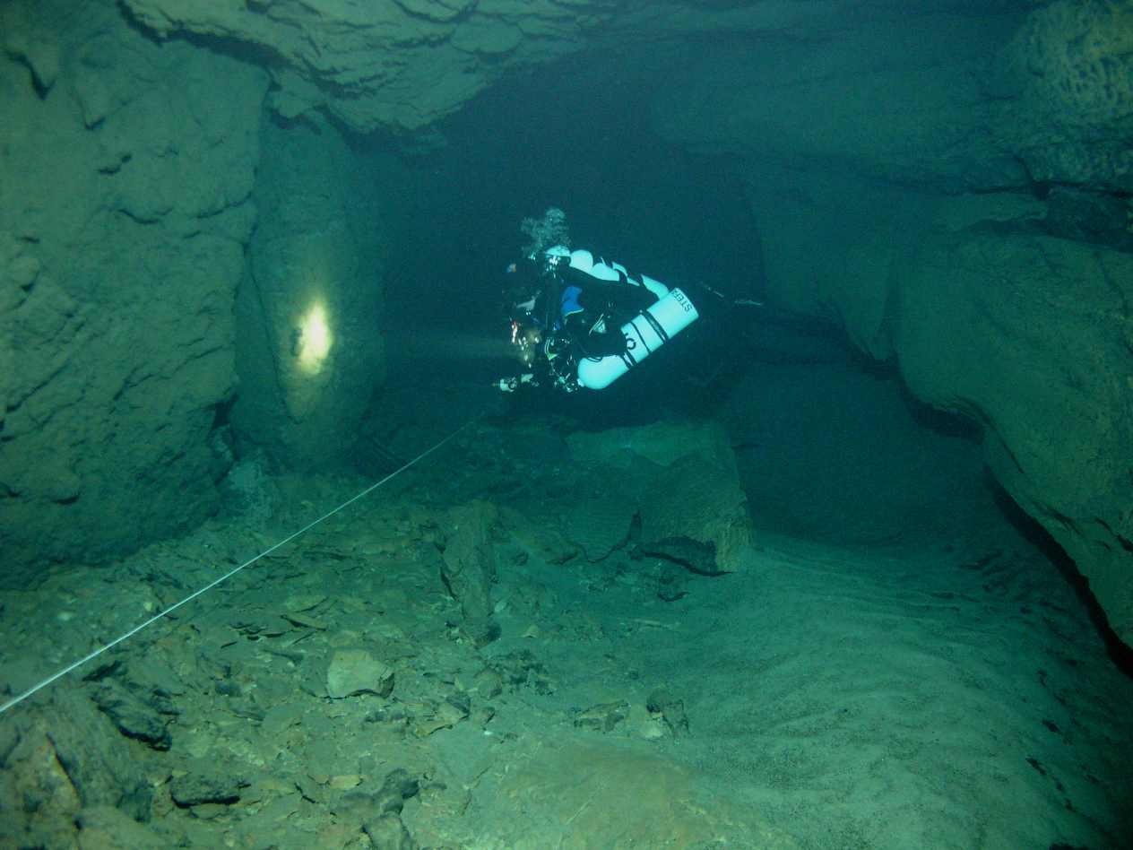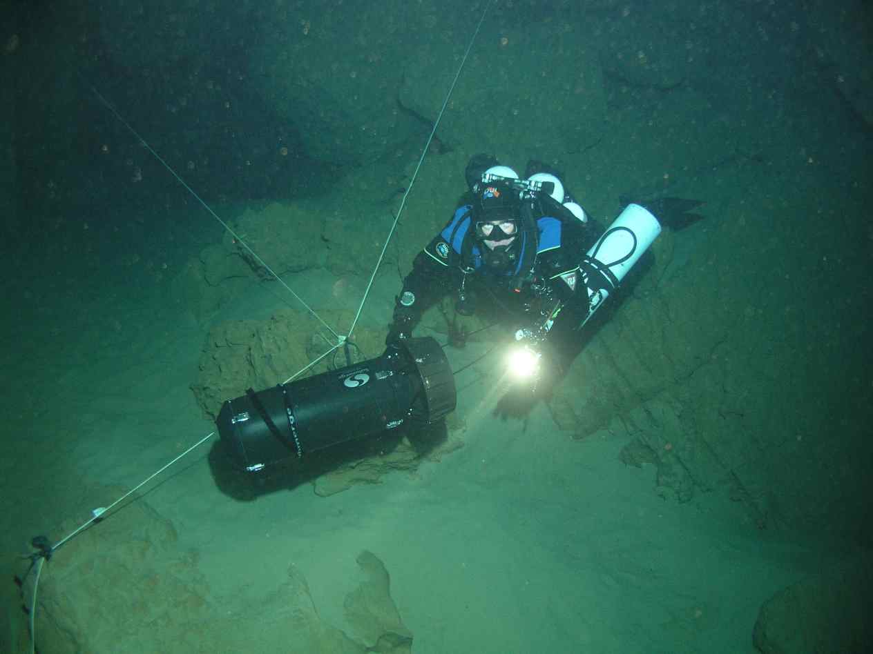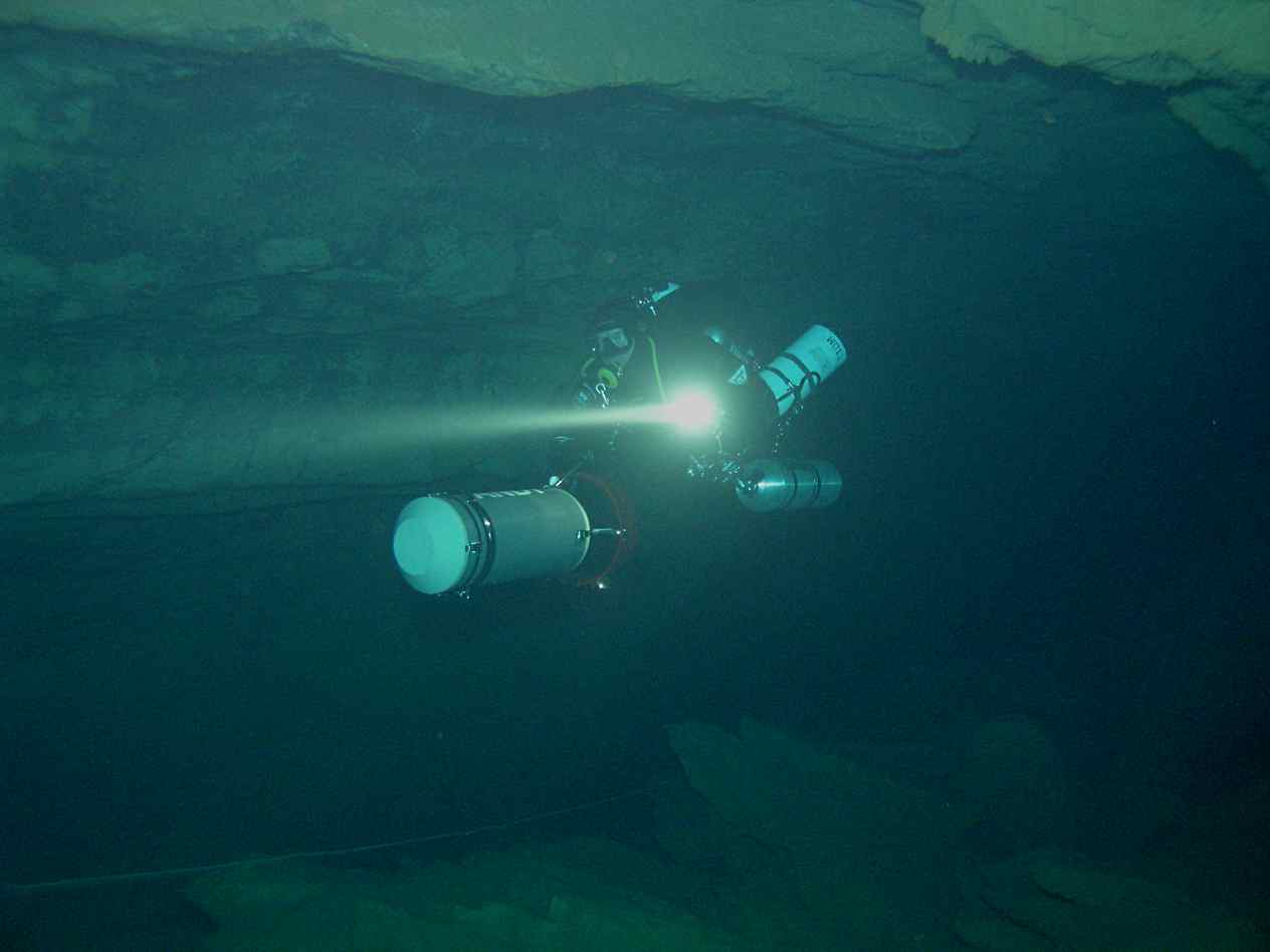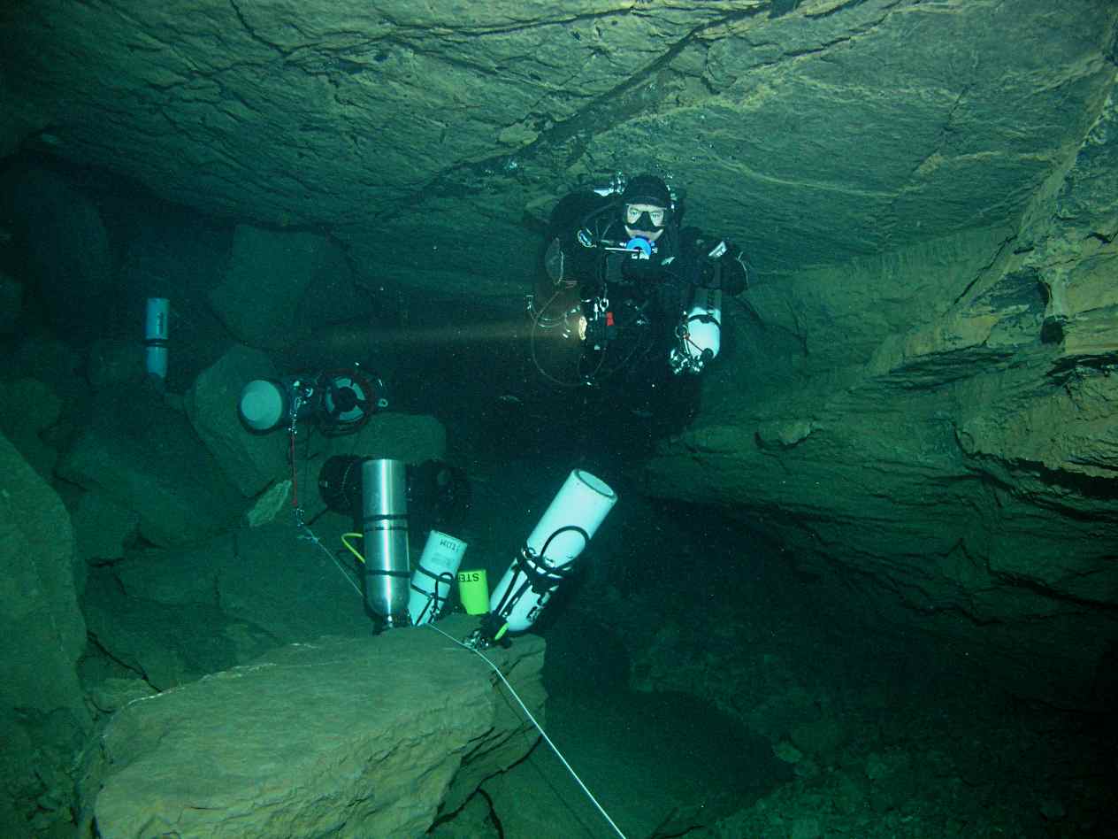So auch diesmal. Der anfänglich recht enge, an einigen Stellen stark einsiltende Gang geht nach 30m in eine geräumige Passage über, die sich vorbei an zwei Nebengängen in Tiefen von 25 - 30m bequem bis zu ihrem Ende, einem senkrechten Spalt betauchen lässt.