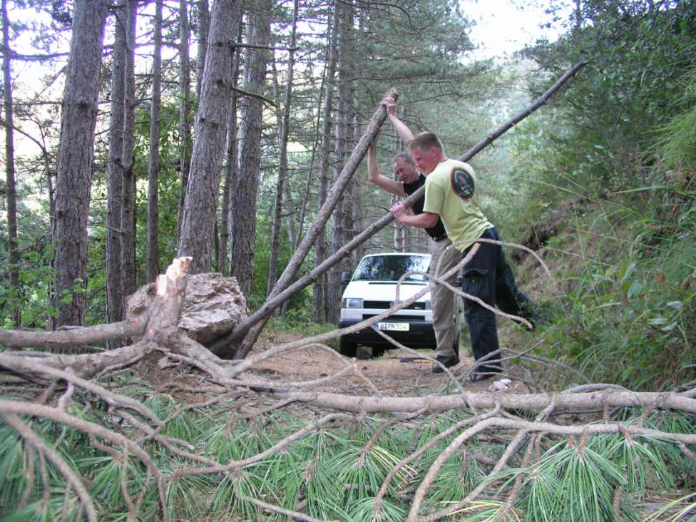 Es gab nur die zwei Möglichkeiten, einige Hundert Meter auf dem engen Weg mit Abhang auf einer Seite rückwärts zu fahren bis zu einer Wendemöglichkeit oder das Viech wegräumen.