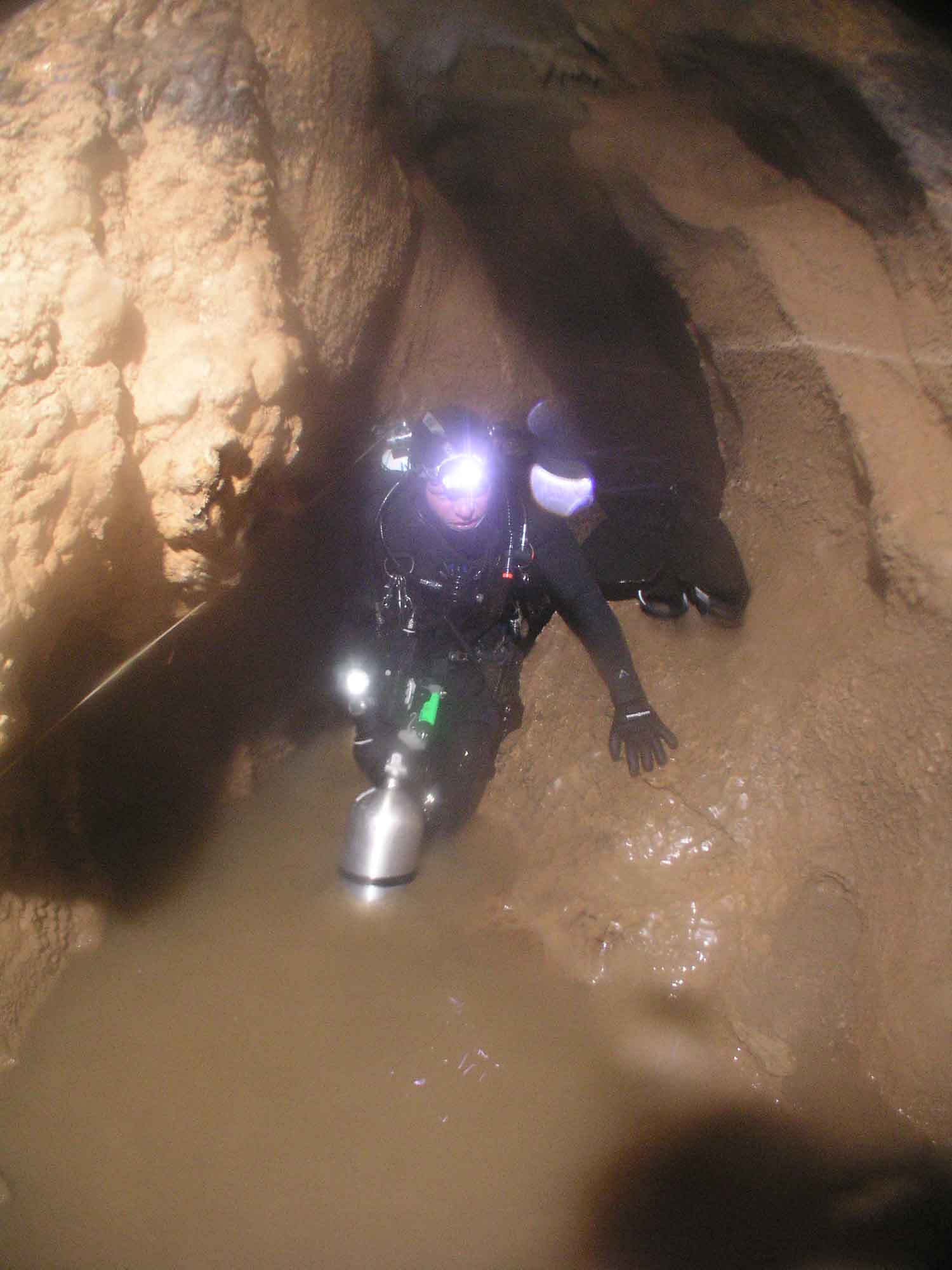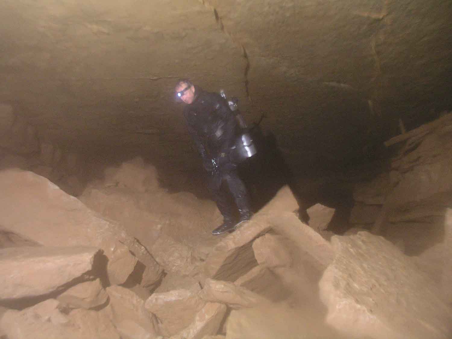 Mit dem Bauch über das Geröll schleifend und stetigem Deckenkontakt öffnete sich die Eingangspassage nach mehreren Metern zu einem kleinen Raum, der gerade genug Platz für zwei Taucher bot.