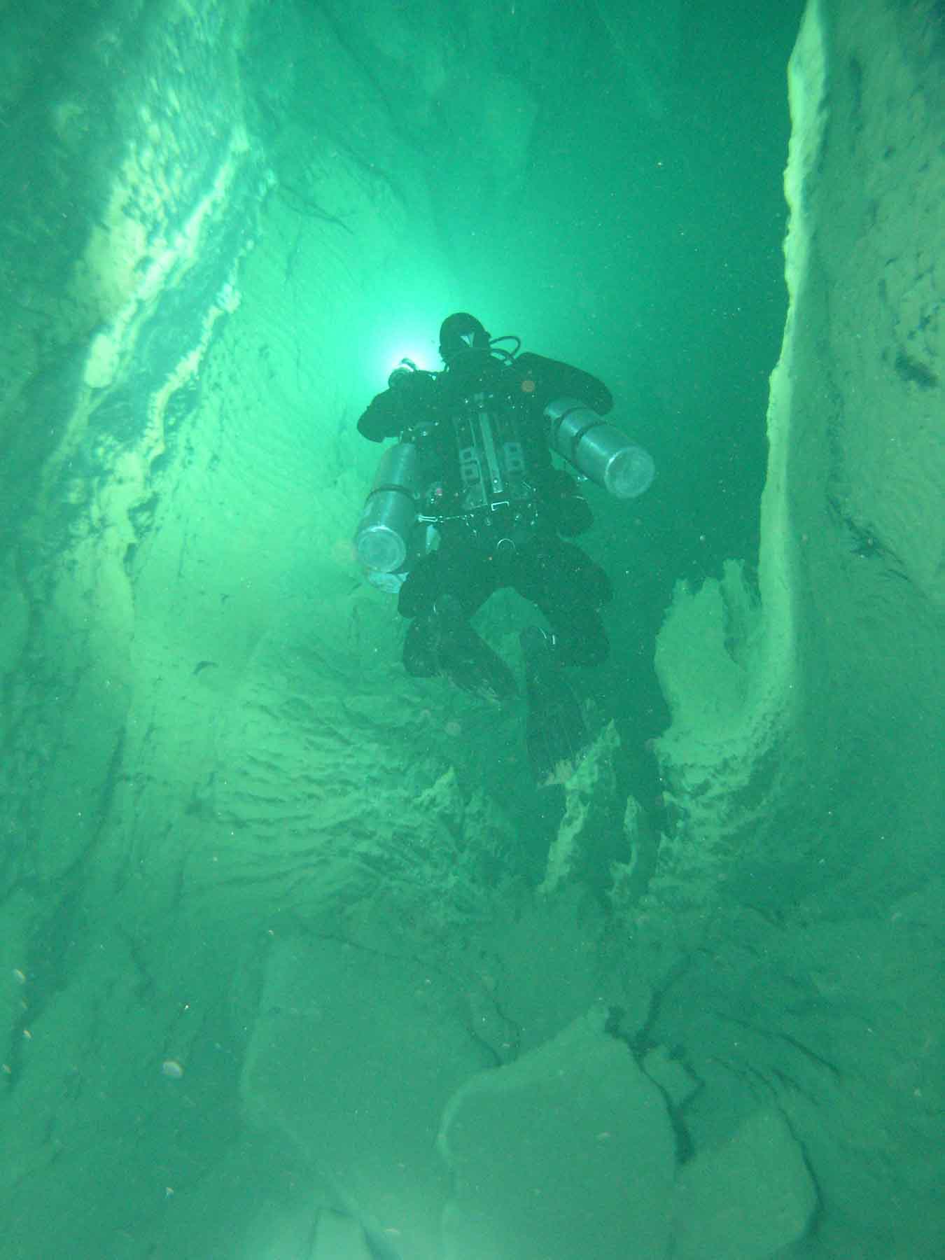 Die Engstelle in 22m Tiefe war zu meinem Erstaunen teilweise frei gespült. Mit dem richtigen Gas hätten mein Freund und ich durchaus tiefer vorstossen können.