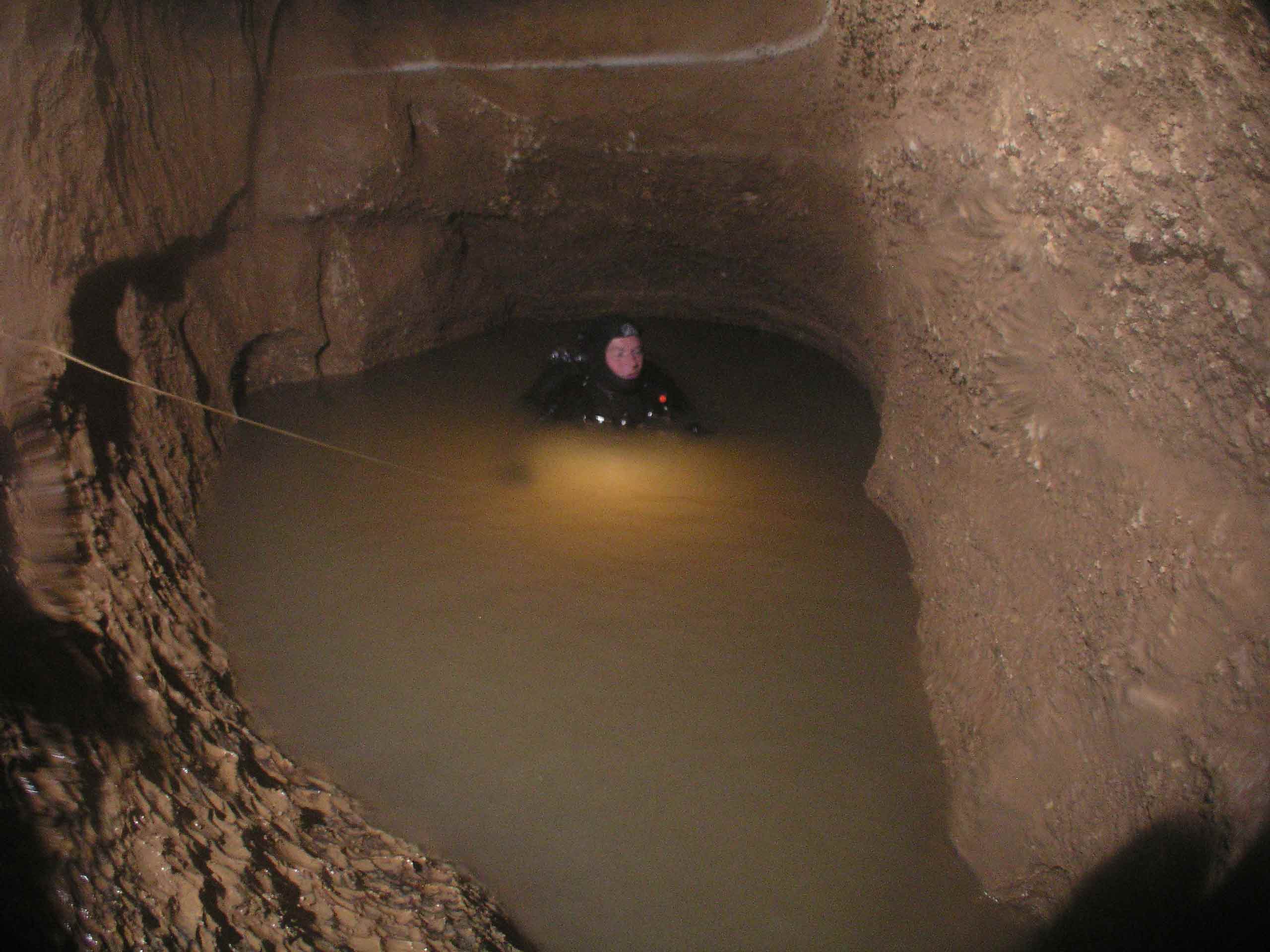 Danach ging es auf allen Vieren im Nassanzug, das Rückengerät geschultert, ein weiteres Mal unter der Straße hindurch. |