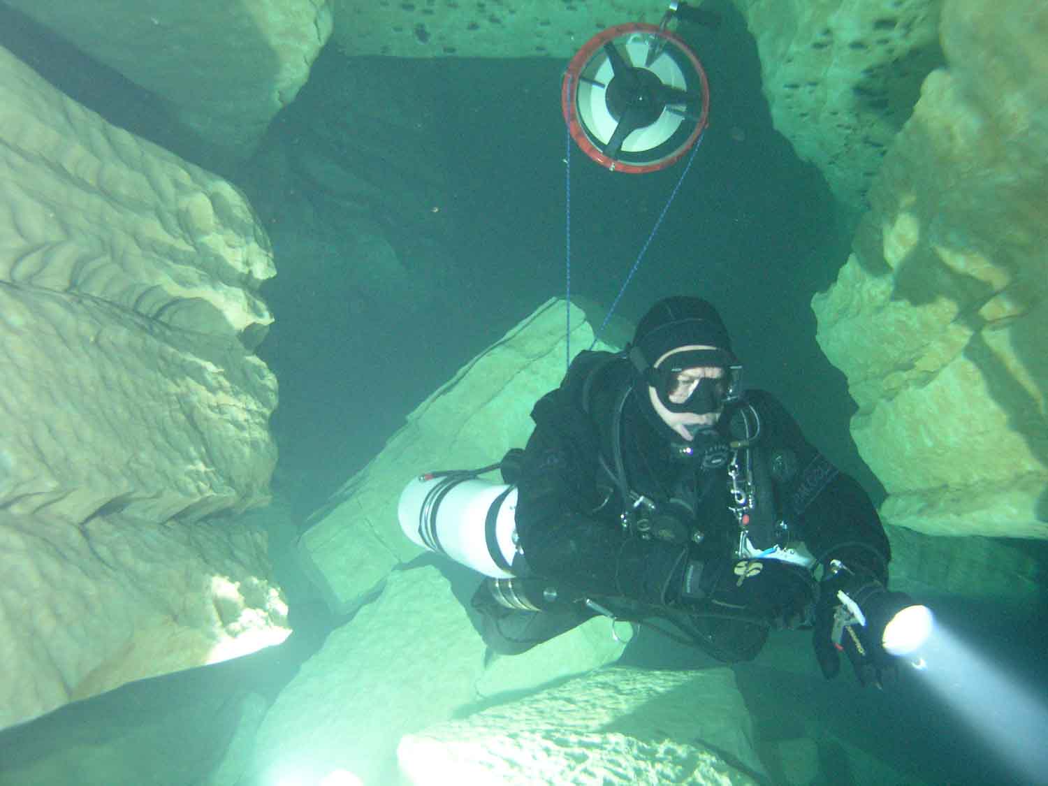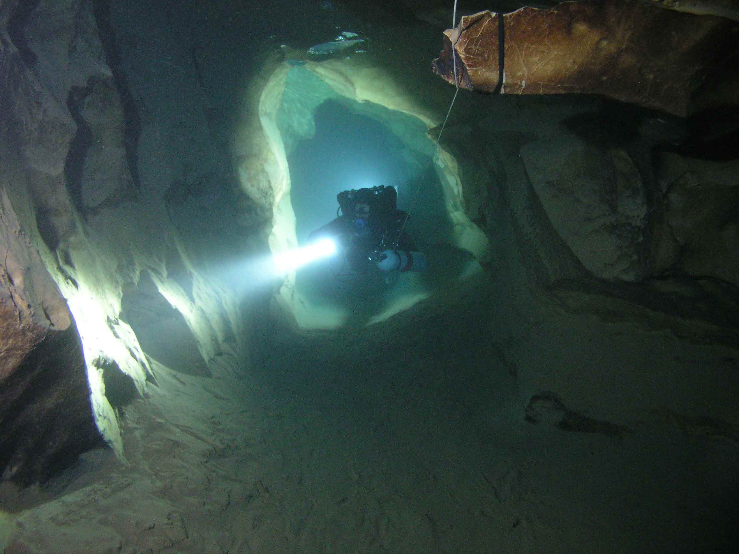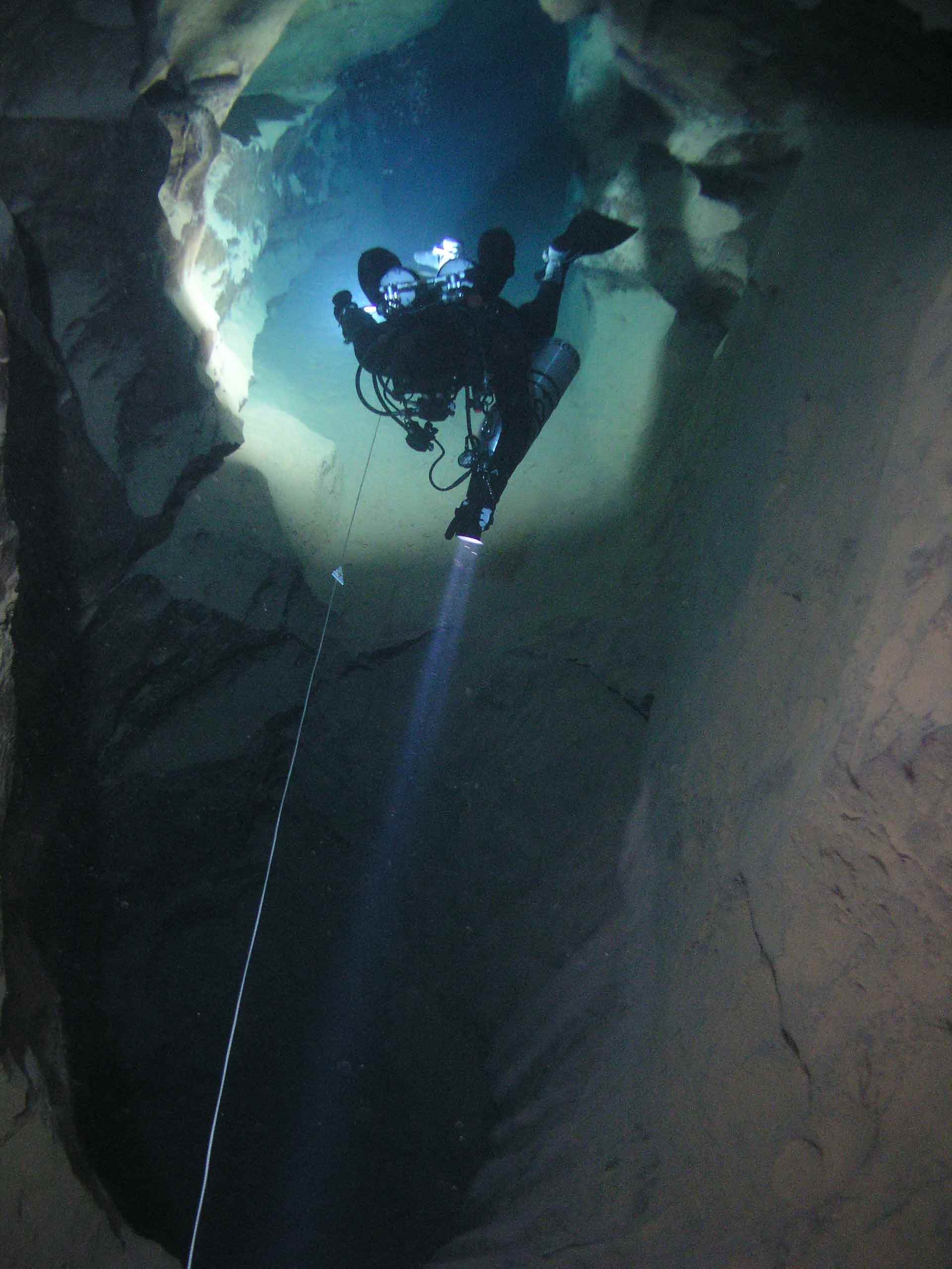 Nach Klarieren der Ausrüstung tauchte ich voraus in die Dunkelheit. Zentimeterweise tastete ich an der Leine entlang.