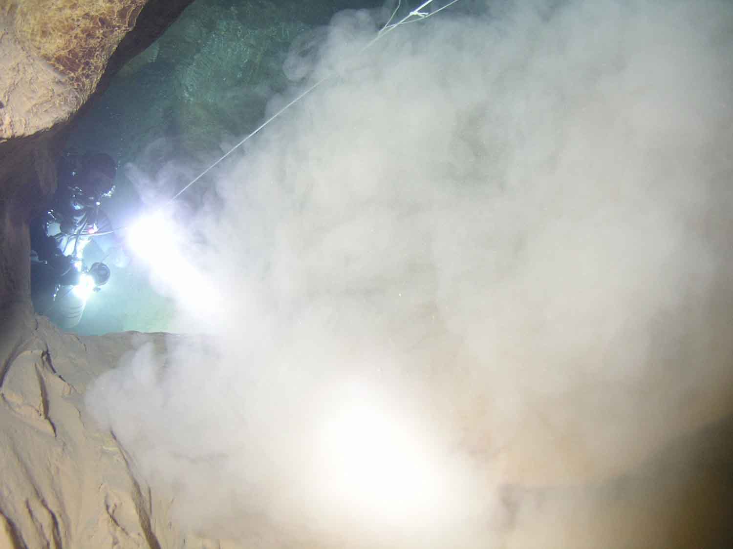 Von der Decke lösten sich durch die Ausatemluft große Sedimentflocken, die die Sicht hinter uns etwas eintrübten.
