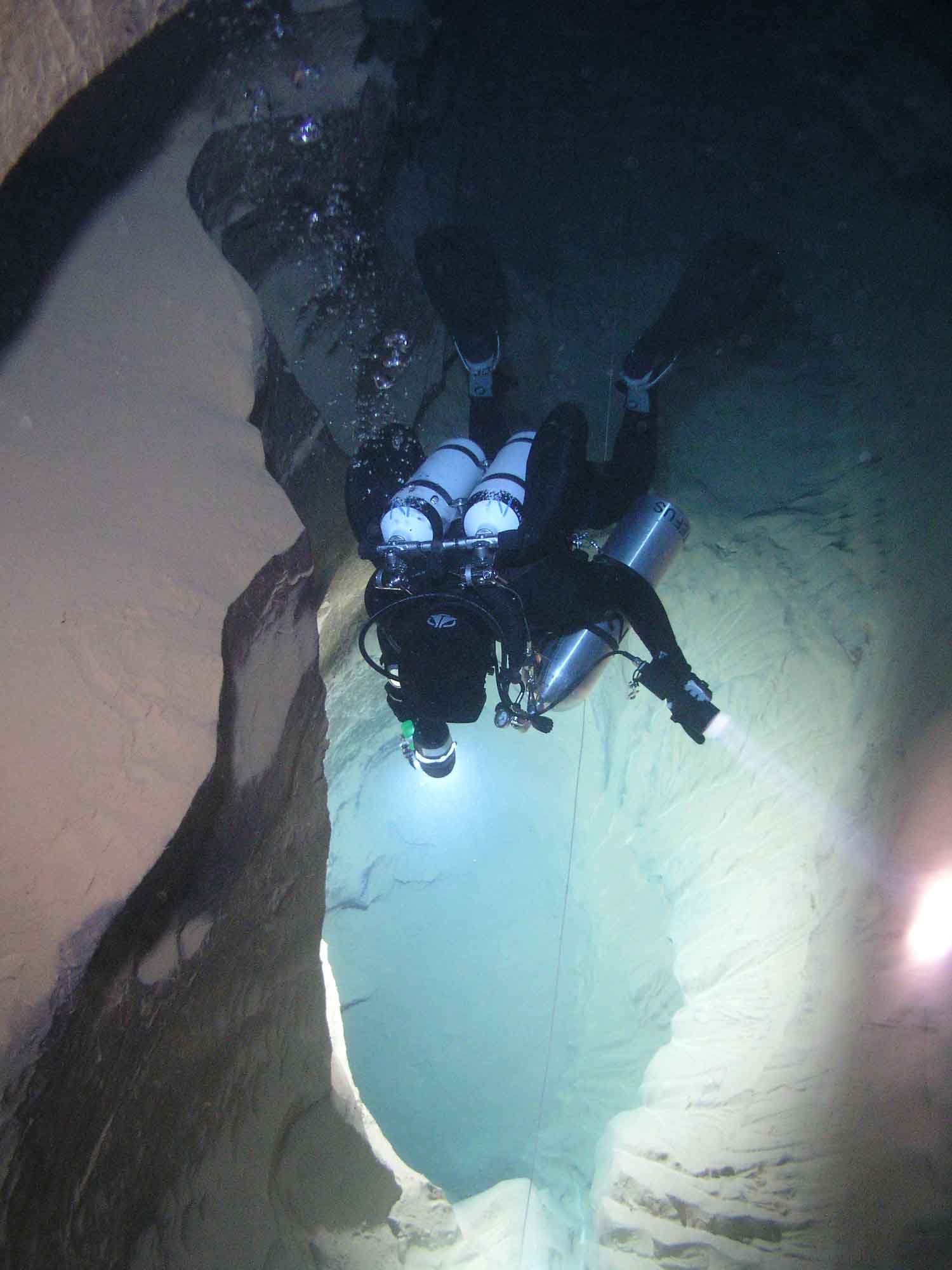 In einem kleinen Nebenraum am Schachtgrund verweilten wir kurz, sogen die Eindrücke in uns auf und tauchten dann den sich anschließenden, steil abfallenden Kieshang unter einer teils flachen Decke hinab bis -32m. Dahinter stieg der Gang wieder an und mündete in eine sehr große Halle.