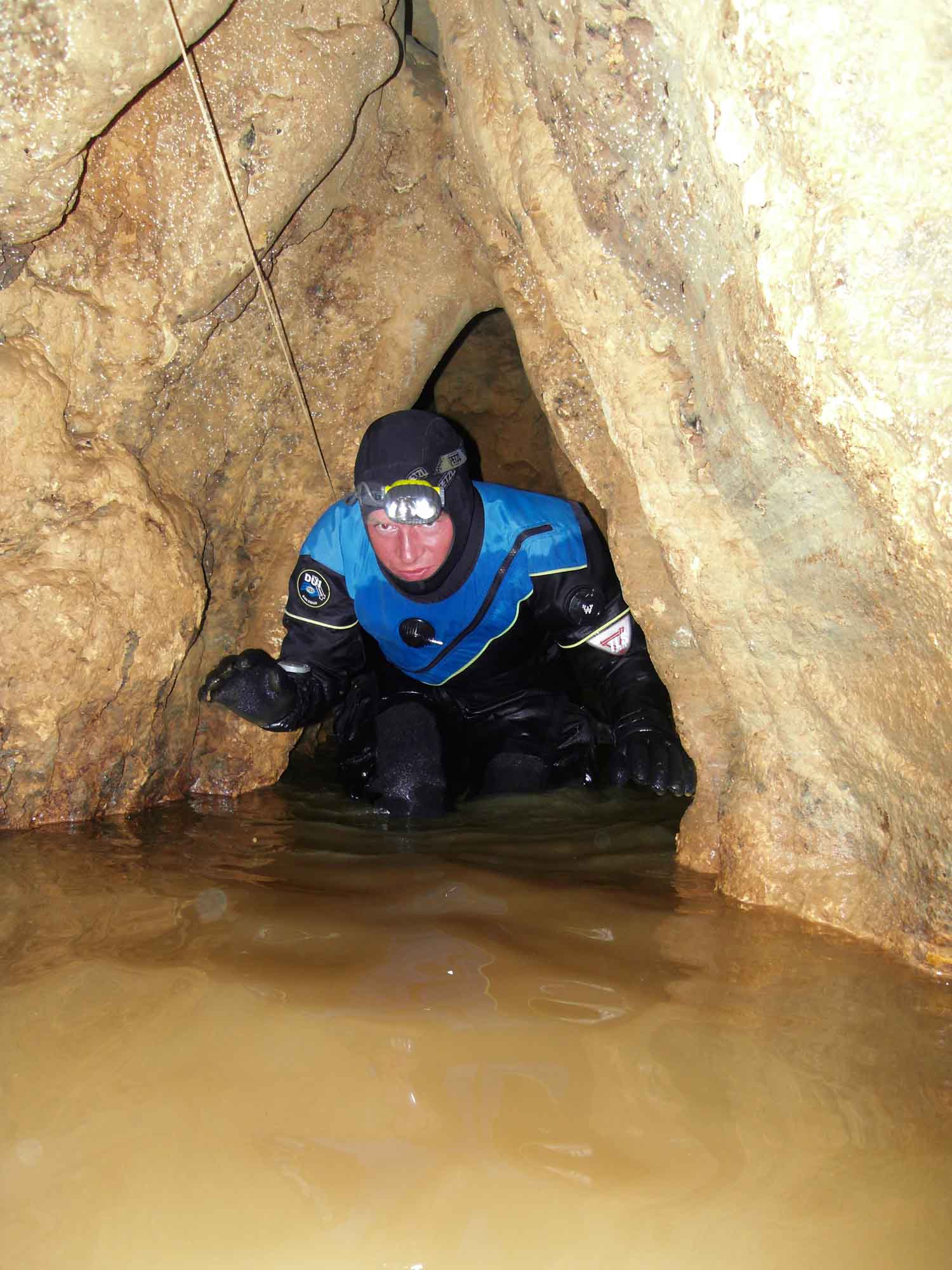 Nach 20m teilte sich die Leine. Nach links führte sie hinein in einen Spalt. Der Hauptgang verlief geradeaus. Ich folgte ihm und mußte mit Erstaunen feststellen, kurz darauf die Wasseroberfläche zu durchbrechen. Natürlich, auch hier machte sich der niedrige Wasserstand bemerkbar.