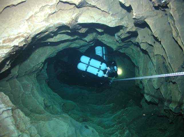 Dort trafen wir auf 3 Feuerwehrtaucher der Höhlenrettung, die mit einem Doppel-7 allen Ernstes einen 60m Tauchgang absolvierten!