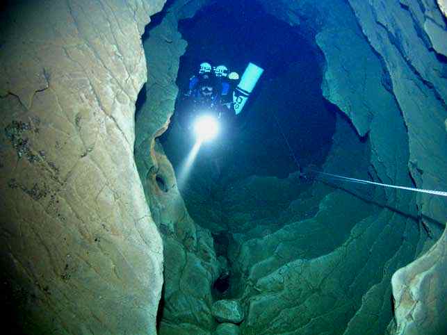 Hinter dem engen Eingangsspalt nahm die Ganggröße rasch zu. Bei ca. 15m Sicht im teilweise 5x8m großen Gang, der schnell auf -30m abfiel, scooterte ich voran, vorbei an dunklen Wänden und Felssäulen.