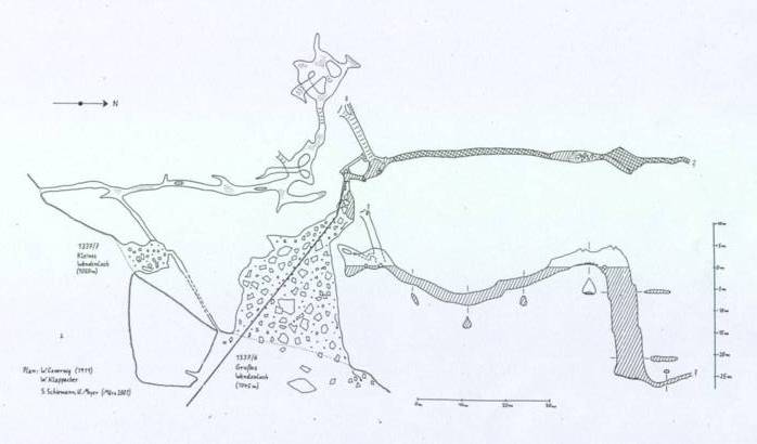 Plan des Wendenlochs -linker oberer Teil: Draufsicht -rechter unterer Teil: Seitenansicht