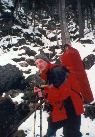 | Das schwerste Stück Arbeit stellte gleich der Aufstieg zu unserem Ziel dar. 140 Höhenmeter waren zu bewältigen auf einem sehr steilen, schneebedeckten Hang. Jeder hatte ca. 30kg an Ausrüstung zu tragen. Ulrich lief mit Schneeschuhen voraus und ebnete mir den Weg ein wenig.