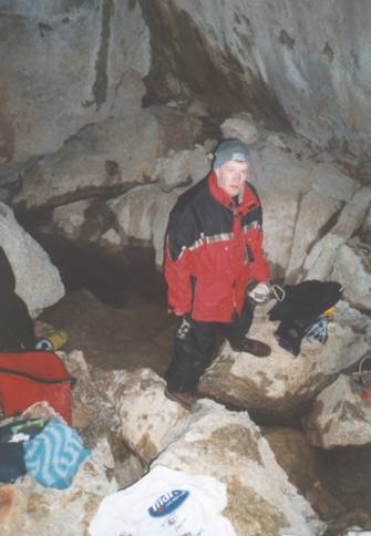 Während ich den Tauchgang mache, will Ulrich den vorderen halbtrockenen Höhlenteil vorm Siphon vermessen. Ich ziehe mich um und lege die Flaschen an.