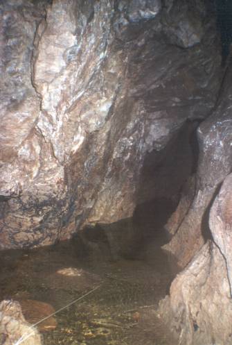 Am Ende dieser Kammer, die 1,50 - 3m hoch ist, entdecke ich den von Franzjoerg Krieg beschriebenen wassergefüllten Schacht, den er im Jahre 1978 aufgrund eines technischen Defektes an seiner Ausrüstung nicht weiter erforschen konnte.