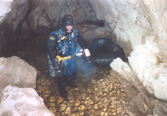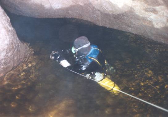 Die Leine wird an einem Fels festgebunden und der Tauchgang beginnt. Beim Abtauchen stelle ich erfreut fest, daß meine Sichterwartungen noch um Einiges übertroffen werden. Das Wasser bietet mir 10 - 12m! Das Gangprofil ist auf den ersten 20 Metern stark nach links abgeschrägt (ähnlich dem Eingangsbereich des Mauslochīs), wunderschön glatt ausgewaschen und sehr bequem zu durchqueren. Gangbreite: 80 - 100cm; Höhe: 1,3 - 1,5m.
