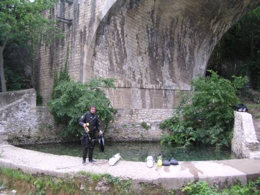 | 1. Tag: Font Vive --- leider in 15m Tiefe kein Weiterkommen, da die Höhle mal wieder verschüttet ist (Sidemount geht)! Passiert immer mal wieder, wenn der Eingang im Frühjahr nicht freigeräumt wurde. |