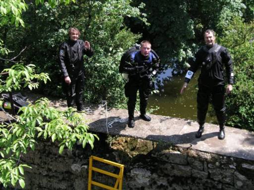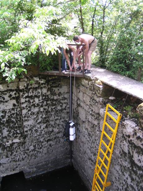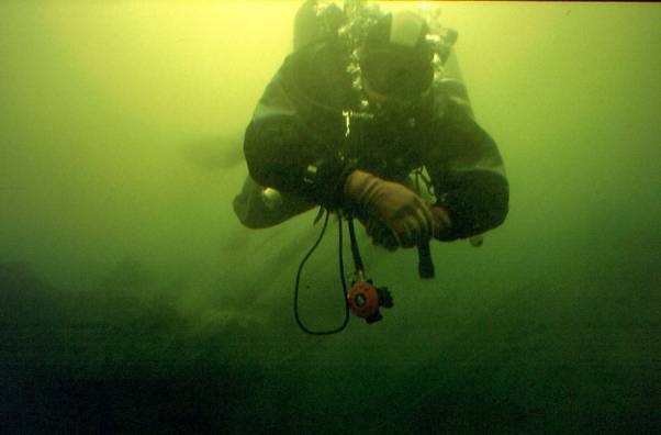 4. Tag: Fontaine de Boude --- Ca. 5h danach gesucht bei richtig beschissenem Wetter u. dann noch fündig geworden! Nassanzug mit Doppel-7! Gut 50m in gebückter Haltung bis S1; Leine an einigen Stellen zerrissen; Sicht etwa 15m beim Reinweg; Gangmaße: 1,50 x 1,50m; nach 45m Auftauchstelle; Kurz dahinter in -6m sehr üble Engstelle, an der wir fast kapituliert hätten; mit Hängen u. viel Würgen durchgekommen--Sicht sofort auf wenige cm!; weiter bis Ende nach 185m in -16m; Der Gang ist dort mit Kieshaufen völlig verschüttet! Rückweg bis Engstelle Sicht recht gut, dann kompletter Silt out!!! Hat einige Versuche benötigt, durchzukommen;-( Trotz der Probleme in der Restriction sehr interessante Höhle mit Versteinerungen u. alten Knochen! Beim nächsten Besuch sollte erst die Engstelle erweitert werden für einen gefahrlosen Rückweg! |  |