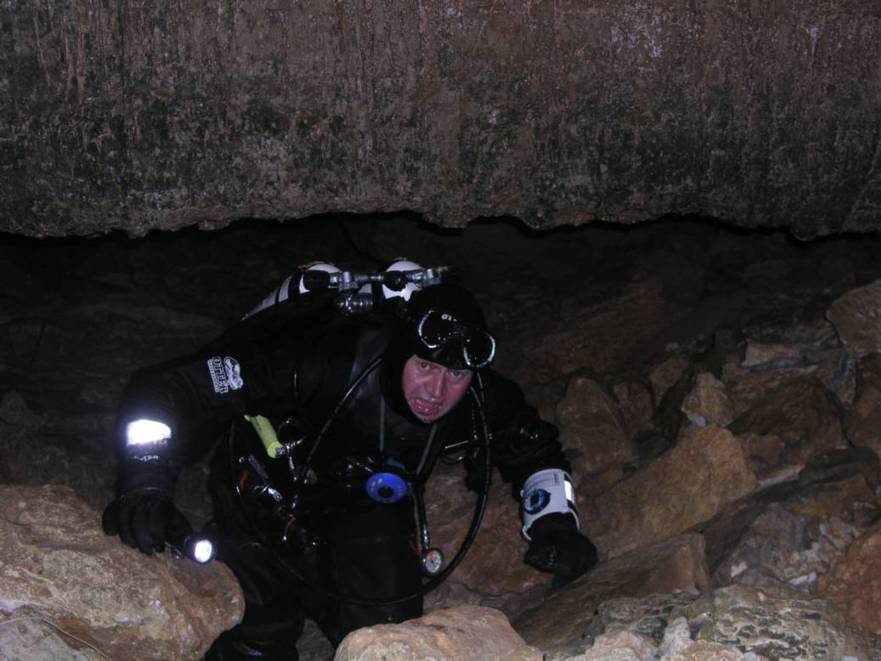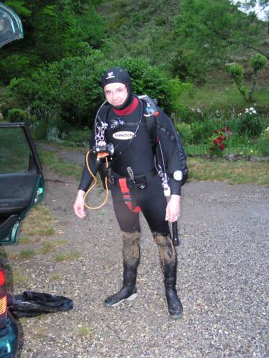 Die Trou Madame war dann ein ziemliches Geschleppe, wobei wir mit Rücksicht auf unsere Freunde schon auf die grösseren Geräte verzichtet hatten u. nur mit Doppel-7 u. 80Cbf Stage reingingen. Bei vielen unserer Tauchgänge benutzten wir das Rückenpaket ausschliesslich als Bailoutgas u. atmeten nur aus den Stages, was aus fülltechnischer Sicht am schlauesten war, da die Stages dann nach dem Tg meist ziemlich leer waren! Sicherer ist es ausserdem! |  |