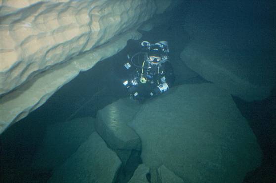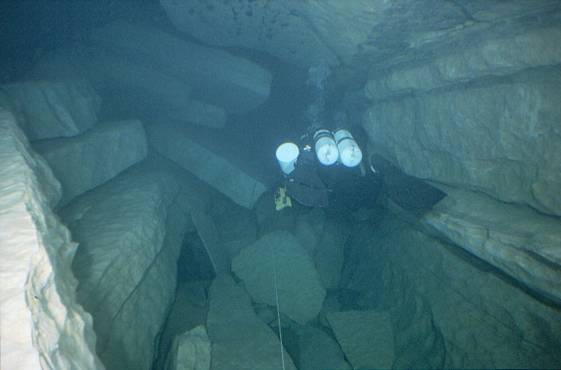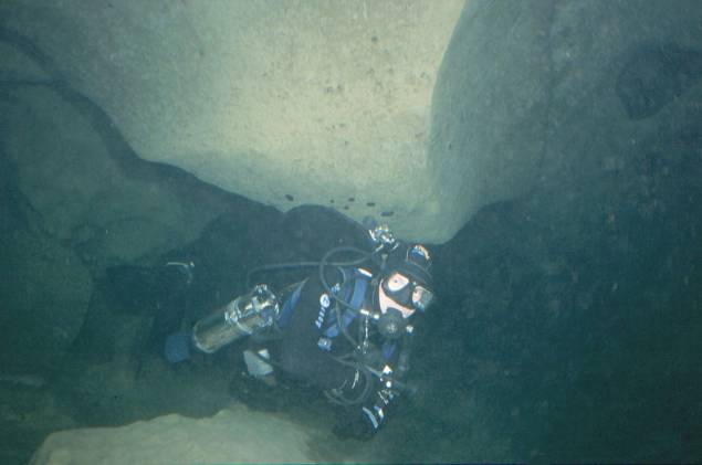 | Die Mounine kannte ich bis dato selbst noch nicht. Wir mußten uns also erst auf die Suche machen, aber mit dem Anfahrtsplan von Ralph Wilhelm war das kein Problem! Mit dem Auto kommt man bis zur Einstiegsstelle am Fluss! Dann keine 5min. flussaufwärts (fast keine Strömung) auf die gegenüberliegende Seite schwimmen u. schon liegt der Eingang zu Füssen! Die Führungsleine ist über dem Wasser an einem Ast befestigt! Die Sicht sollte mit max. 5m leider recht bescheiden bleiben, was der ganzen Sache aber erst den richtigen Pepp verlieh, denn das gab der Höhle etwas Geheimnisvolles. Der Eingang ist viel grösser als an der Ressel. Es geht schnell auf -11m ab, dann steigt die 2 x 3m grosse Passage stetig an, bis in gut 200m Entfernung der flachste Punkt mit -3m erreicht ist. Dahinter biegt der Gang scharf nach rechts weg. Hier ist auch ein kleiner Absatz runter auf -7m. Etwa 30m weiter kommt man nach einem weiteren Absatz an ein T in etwa -17m! Eine riesige Passage (nicht überschaubar bei den Sichtverhältnissen, aber geschätzt etwa 8 x 10m) liegt vor einem. Nun hast du die Wahl zwischen 2 Richtungen! Nach rechts steigt die Leine leicht auf. Da wir uns aber für links entschieden, kann ich nicht sagen, wie´s 10m aussieht. Die linke Passage fällt kontinuierlich ab. Gut 70m hinter dem T´ in -23m kam unser Umkehrpunkt. |