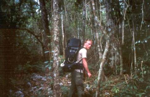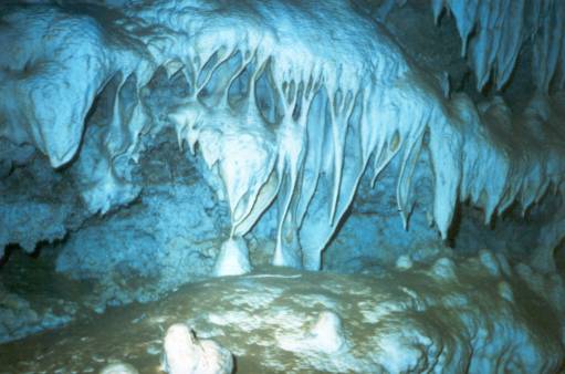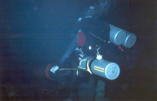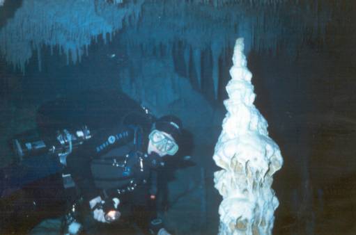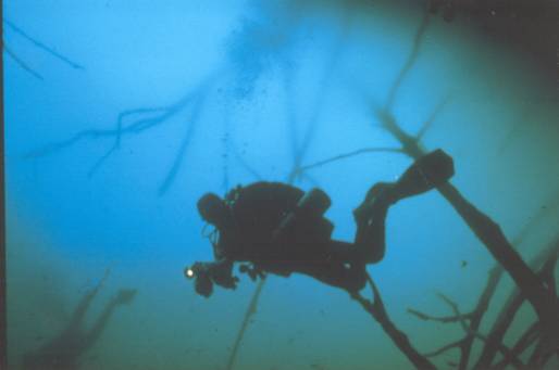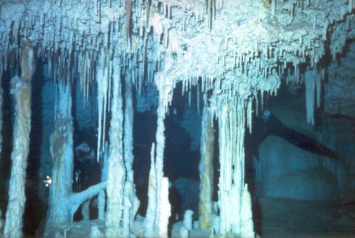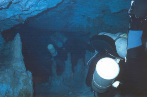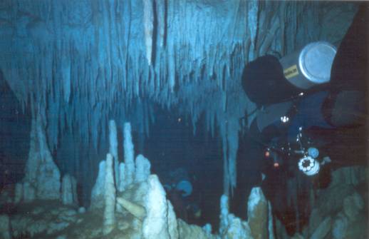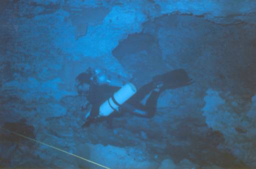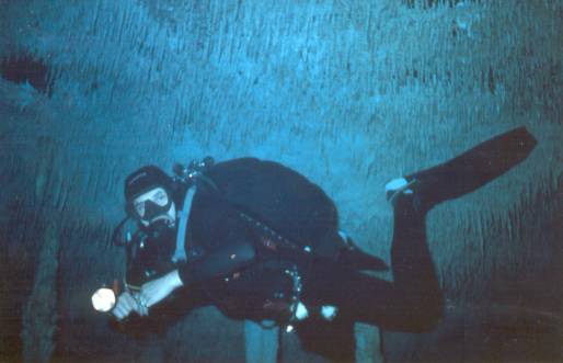 | Zum Kurs gehörten 15 Cavetauchgänge u. ein OWtg.! Am 2. Tag gingīs nach Carwash, wo Ben im Astgewirr vorīm Eingang einen wahren Leinenwirrwarrkurs zauberte, an dem erst allein ohne Maske, dann zu zweit(Tauchpartner war ein Sachse namens Heiko,der mit mir den Full Cave machte) mit geschlossenen Augen entlanggetaucht wurde, wobei jeweils einer am langen Schlauch des anderen vorantauchte. War sehr interessant! Es folgten 1 Tg upstream zum Eingewöhnen, dann einer downstream (bei Umkehrpunkt zurück mit Backuplight). 3.Tag: Wieder Carwash Downstream 20min. rein, bei Umkehr Out of Air meines Tauchpartners u. totaler Lichtausfall; zurück an Leine! Dasselbe dann nochmal andersherum. | ![]() |