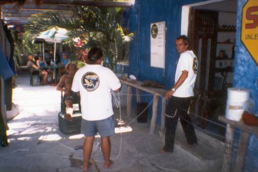 Mexico 2002Nun sollte er also wahr werden, mein großer Traum, endlich einmal im faszinierendsten Höhlentauchgebiet der Welt zugegen zu sein! In den letzten 3 Jahren habe ich mich immer davor gescheut, dort runterzufliegen, da klar ist, daß es ein ziemlich teurer Spaß werden würde. Nun war aber der Tag gekommen, diese Befürchtungen von sich zu schieben, und das aus gleich mehreren Gründen. Zum einen ist Mexico ja nun mal unbestritten das Höhlentauchmekka schlechthin auf diesem Planeten, zum anderen wollte ich endlich meinen Full Cave Kurs nachholen, also warum nicht gleich unter besten Bedingungen?! Der Flieger ging um 7.25Uhr. Knapp 2h bis London, von da weiter nach Miami. Dort nach ca. 12h angekommen, mußten wir uns durch die Immigration-Zone kämpfen. Wir hatten dazu 1h40min. Nach Ablauf der Zeit mußten wir leider feststellen, daß sie nicht gereicht hatte, unseren Anschlußflieger zu bekommen. Hauptmankos waren, daß seit dem 11.Sep. kein Durchchecken des Gepäcks mehr möglich ist, an unserm Eincheckgate keine Gepäckaufnahme vorhanden war u. die Amis bei der Abfertigung in der Immigration-Zone eine Arschruhe weghatten!!!;-((( Das hatte eine Übernachtung in Miami zur Folge. Egal. War dann sogar noch recht lustig. Gutes Hotel mit Abendbrot, Frühstück (alles von American Airlines gesponsort(außer alkohol. Getränken; shit...)) und Shuttle. Am Morgen darauf gingīs um 11Uhr weiter nach Cancun. Glücklicherweise wartete dort ein Taxi auf uns (Gunnar hatte mitgedacht) u. so waren die letzten 1 1/2h Fahrt ein Klacks. Unsere Basis sollte das Aktun Dive Center von Gunnar Wagner in Tulum sein. Er bildet seine Schüler wahlweise auf deutsch, englisch o. spanisch nach NACD u. IANTD aus! An Gasen stehen neben Luft auch Nitrox sowie Sauerstoff zur Verfügung!