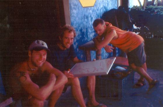 | Gunnar hatte leider gesundheitliche Probleme, sodaß mein Kurs erstmal mit 1 Tag Theorie begann. Sehr ärgerlich, denn ich konnte es gar nicht erwarten, in die Höhlen zu kommen, aber muß halt auch erledigt werden. Bis auf 2 TG sollte der komplette Kurs von Ben Cook (Bildmitte), einem supernetten Engländer von den Bahamas, abgehalten werden. In den gesamten drei Wochen hatte der Mann keine Minute schlechte Laune! | ![]() |