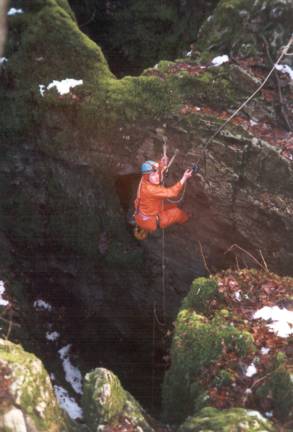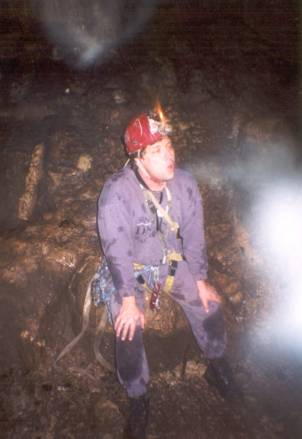 | Ulrich und ich legten die SRT-Ausrüstung an. Da mein Freund der Erfahrenere von uns beiden ist, bildete er die Vorhut und sicherte das Seil an mehreren Punkten. Ich folgte ihm wenig später. Die ersten 20m gingen zügig vonstatten, als ich aber durch die Höhlendecke kam, rutschte mir fast das Herz in die Hose! Mein Freund unter mir am Höhlenboden sah so winzig aus! |  |