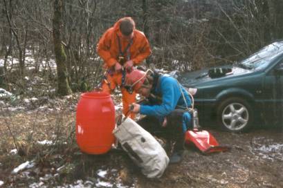 | Etwa 1 1/2h später waren wir am Ziel. Vor uns in einem Waldstück öffnete sich ein tiefer Schlund. Ulrich erlählte uns, dass es von der Oberkante bis zum Höhlenboden 40m sind. Bei 20m kommt man durch die Höhlendecke und legt den Rest freihängend zurück! Also genau die richtige Freizeitbeschäftigung für vier arbeitslose Höhlentaucher;-) |