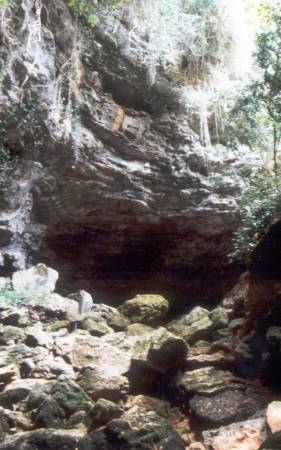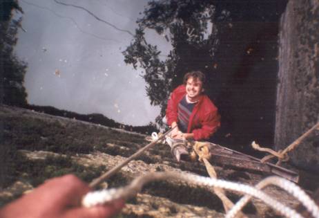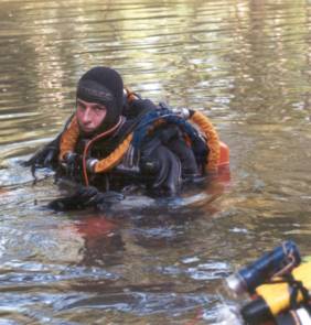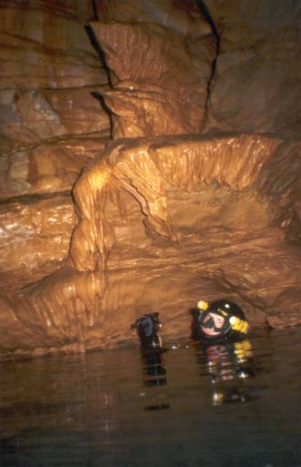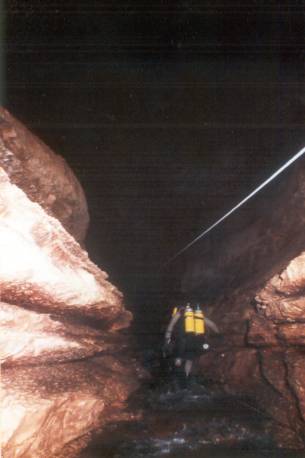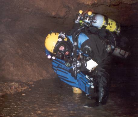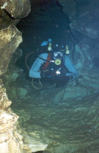 | An der Höhle trafen wir auf Martin Robson, seines Zeichens Cave Instructor, nebst 2 Schülern. Nach einem kurzen Talk schleppten wir unsere Doppel-10 durch´s Bachbett zum Eingang. Dann in die Anzüge, Geräte angelegt u. auf allen Vieren durch den flachen Eingang. Nach einer kurzen Verschnaufpause begannen unser erster richtig guter Tauchgang! Die Sichtverhältnisse waren auf den ersten 100m durchwachsen, da die Engländer bereits zu Ausbildungszwecken in der Höhle waren. Dann aber wurde es immer besser mit max. 20m Sicht! Nach 700m drehten wir um. Beim Rauskriechen zerlegte Sebastian das Testtube seiner Kabellampe, weil er es zu eilig hatte, aus dem Anzug zu kommen (wir besaßen leider noch keine P-Valves). Also der nächste Schock! |  |