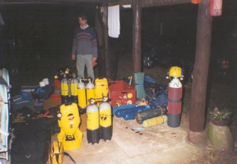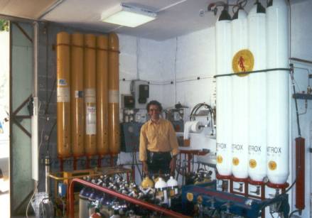 | Also ab nach Gramat und André Grimal aufgesucht, den Besitzer der Füllstation. Als er seine Garage öffnete, verschlug es uns fast die Sprache. Die Anlage war die Wucht!!! Auf dem Foto ist nur etwas mehr als die Hälfte zu sehen! André bietet alles an Gasen, was man sich wünscht! Luft, Nitrox und Trimix und Sauerstoff stehen zur Wahl. |