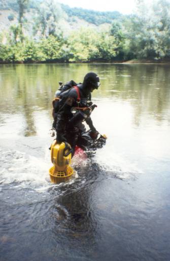 Negativ in Erinnerung blieb unser Versuch, an die "Meyraguet" zu gelangen. Ich hatte den grandiosen Einfall, dass unsere Scooter uns einfach den Fluss hinauf bis zum Eingang ziehen könnten! Leider war dieser auf den ersten 50m zu flach für einen Einsatz der Apollo´s und die Strömung doch etwas stärker, als vorher von uns eingeschätzt. Nach 100m gaben wir entkräftet und schweißgebadet auf. |  |
