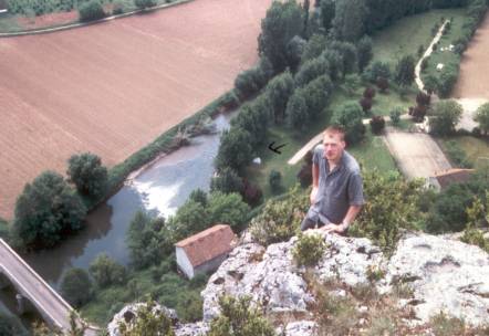 | Einige Tage später suchten wir die "Oeil de la Doue" auf. Zwischen uns und dem Eingang lag erst einmal ein 1000m langer, schmaler Pfad. Genau das richtige für die Doppel-7er mit Nasstauchanzug. Über das normal trocken liegende Bachbett entlang des Weges ergoss sich ein Bächlein mit klarem Wasser. Das versprach gute Bedingungen. Im letzten Jahr bot sich mir eine Maximalsicht von höchstens 3m! Dieses Jahr sollte es viel besser werden, was gleich beim Abtauchen zu erkennen war. Schätzungsweise 15m gab die Höhle uns im ersten Siphon. Nach 40m mußten wir aus dem Wasser. Hier beginnt eine wunderschön ausgewaschene Trockenpassage mit teilweise riesigen Strudelkolken am Boden, die einen bei Unachtsamkeit bis zum Bauchnabel verschlucken! Nach Überwindung dieses Abschnittes begann der eigentliche Tauchgang. Im zweiten Siphon schien das Wasser noch viel klarer zu sein. Ab hier ändert die Doue auch ihr Gesicht. Über dem kompletten Boden sind angeschüttete Sandmassen ähnlich einer Dünenlandschaft verteilt. Ich habe jedes Mal das Gefühl, über einer Wüste zu schweben! Etwa 250m später kam unser Umkehrpunkt. |  |