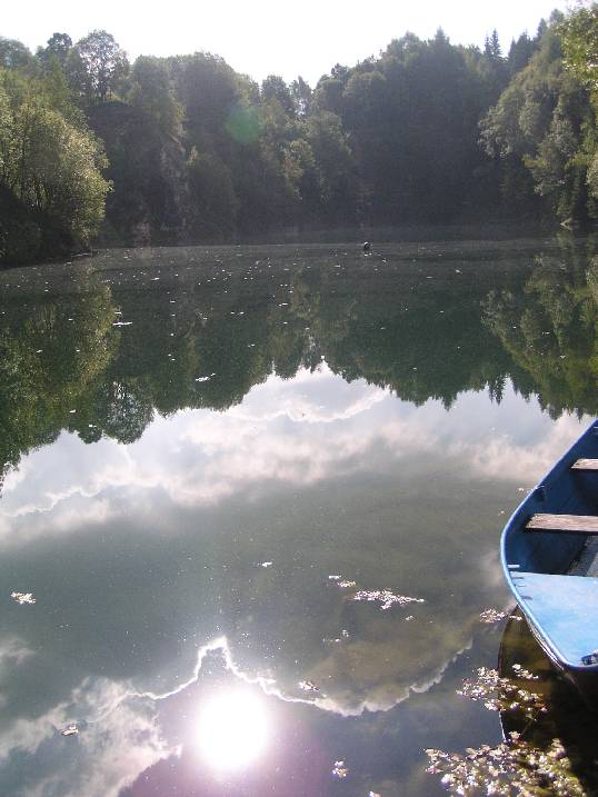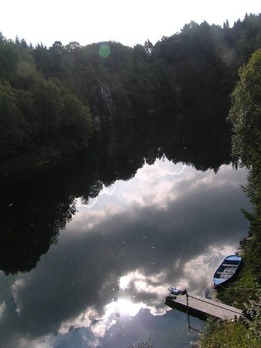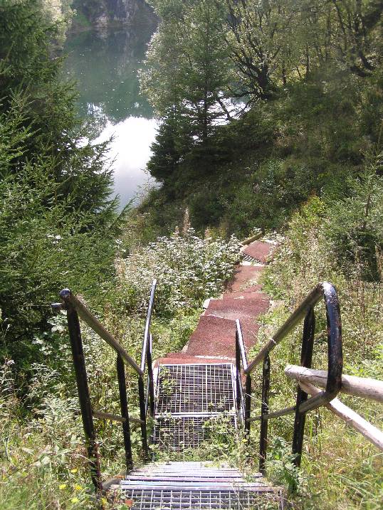 | Der Abstieg ans Ufer des kleinen Steinbruches über künstlich angelegte Steinstufen sollte dann nicht ohne sein, wie mein Tauchparter aus Berlin wenig später feststellen würde (Knöchel verknackst!). Ein kleiner Steg diente zum An- und Ablegen des restlichen Tauchgerödels. Hoffen hatte seinen kleinen Apollo-Scooter mitgebracht, der sich als sehr hilfreich erwies, denn bis zum Eingang lag ein gutes Stück Schwimmstrecke vor uns. |  |