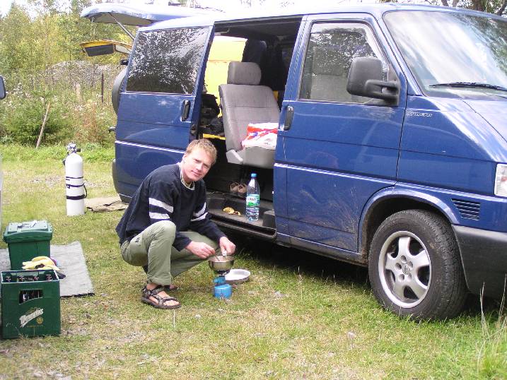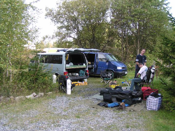 Der nächste Morgen empfing uns mit viel Sonne! Nach einem selbstgemachten Frühstück begannen wir mit den Tauchvorbereitungen. Olaf und Lutz gaben mir Frischling eine kurze Einweisung. |  (Unser kleines Camp) |